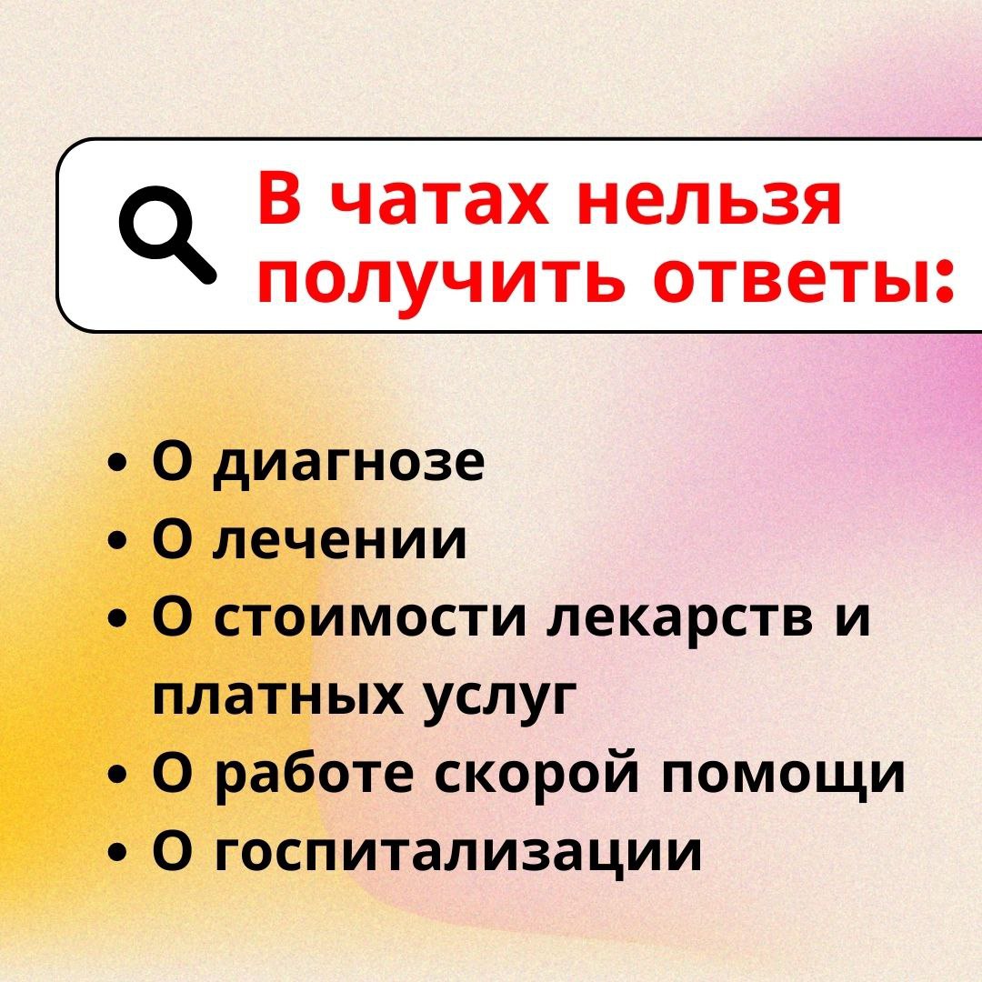 В чатах нельзя получить консультацию по лечению и назначению лекарственных препаратов, наличию лекарственных препаратов в аптеках, работе скорой медицинской помощи, вопросам экстренной госпитализации и постановке диагноза.
