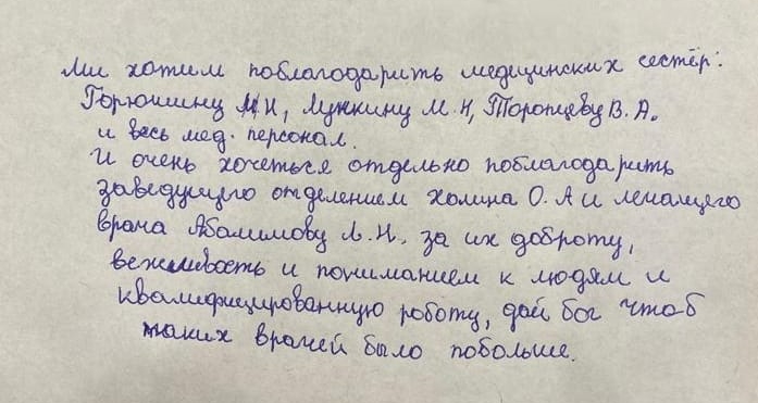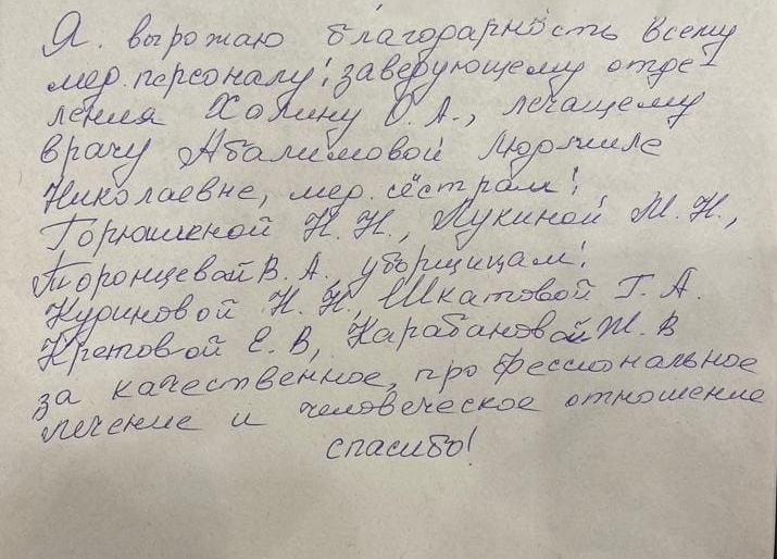 Благодарности адресованы заведующему стационарным отделением Холину Олегу Анатольевичу, врачу - дерматовенерологу Абалимовой Людмиле Николаевне, медицинским сестрам Горюшеной Н.Н, Лукиной М.Н, Торопцевой В.А, уборщицам Кудиновой Н.Н., Шкатовой Г.А, Кретовой Е.В, Карабановой Ж.В