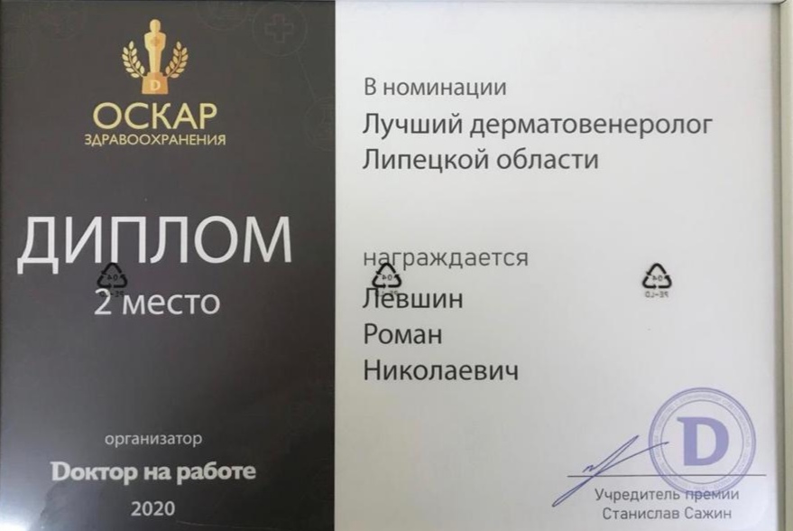 Врач-дерматовенеролог Елецкого филиала ГУЗ ОКВД Левшин Роман Николаевич стал лауреатом ежегодной премии «Оскар здравоохранения» по выбору интернет-сообщества «Доктор на работе».