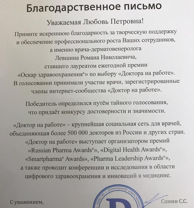 Дерматовенеролог Левшин Р.Н. стал лауреатом премии «Оскар здравоохранения».