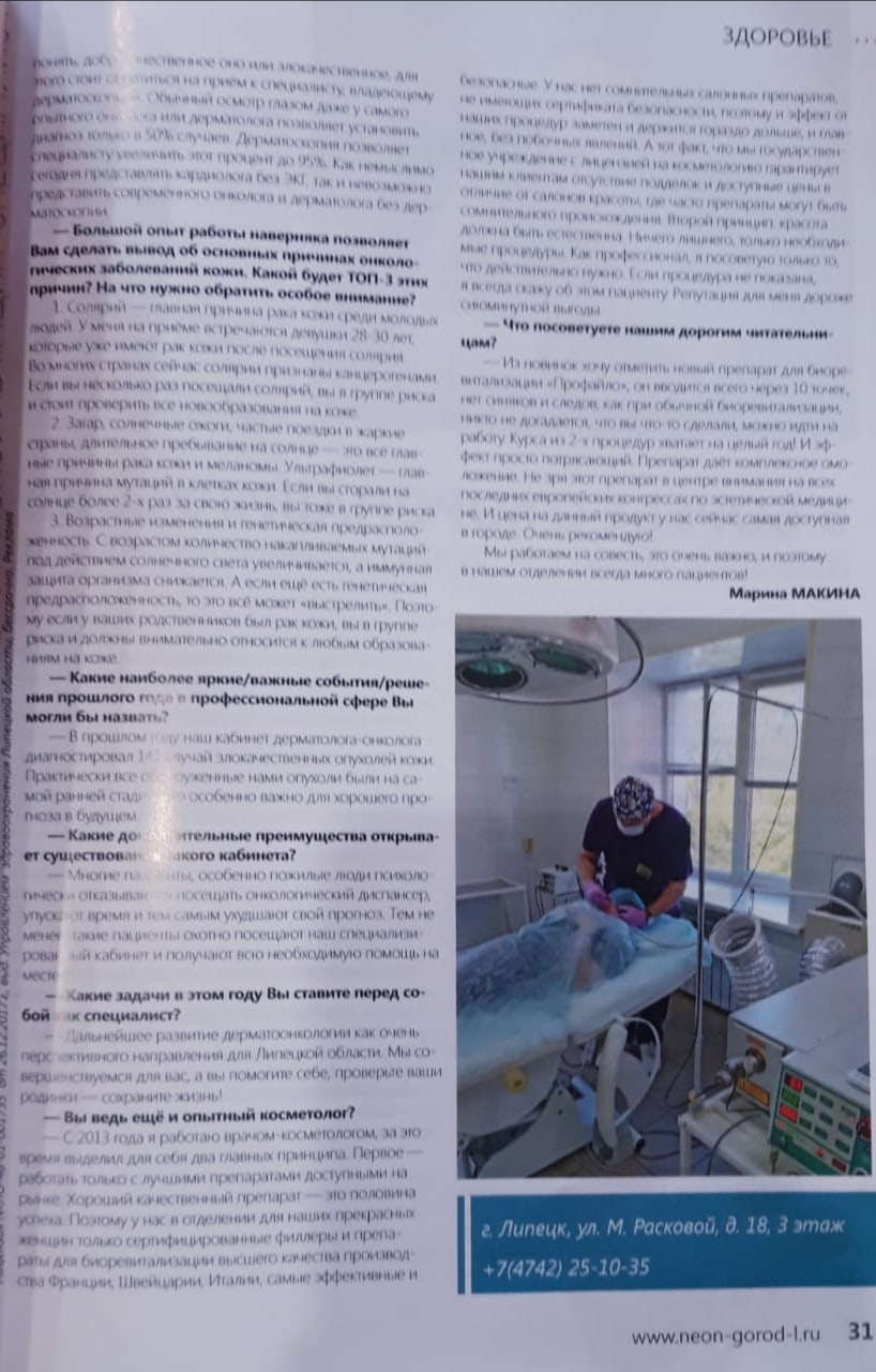 В интервью, опубликованном в майском номере журнала, доктор Якушенко напоминает читателям о таких грозных заболеваниях как меланома и рак кожи, и рассказывает о современных методах их ранней диагностики (дерматоскопии).
