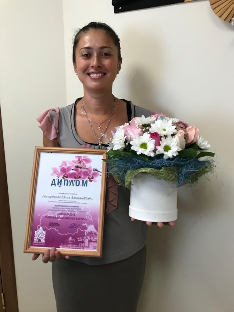 Главная медицинская сестра ГУЗ «ОКВД» Юлия Александровна Вострикова получила диплом Всероссийского конкурса профессионального мастерства организаторов сестринского дела «Главная медсестра года – 2019».